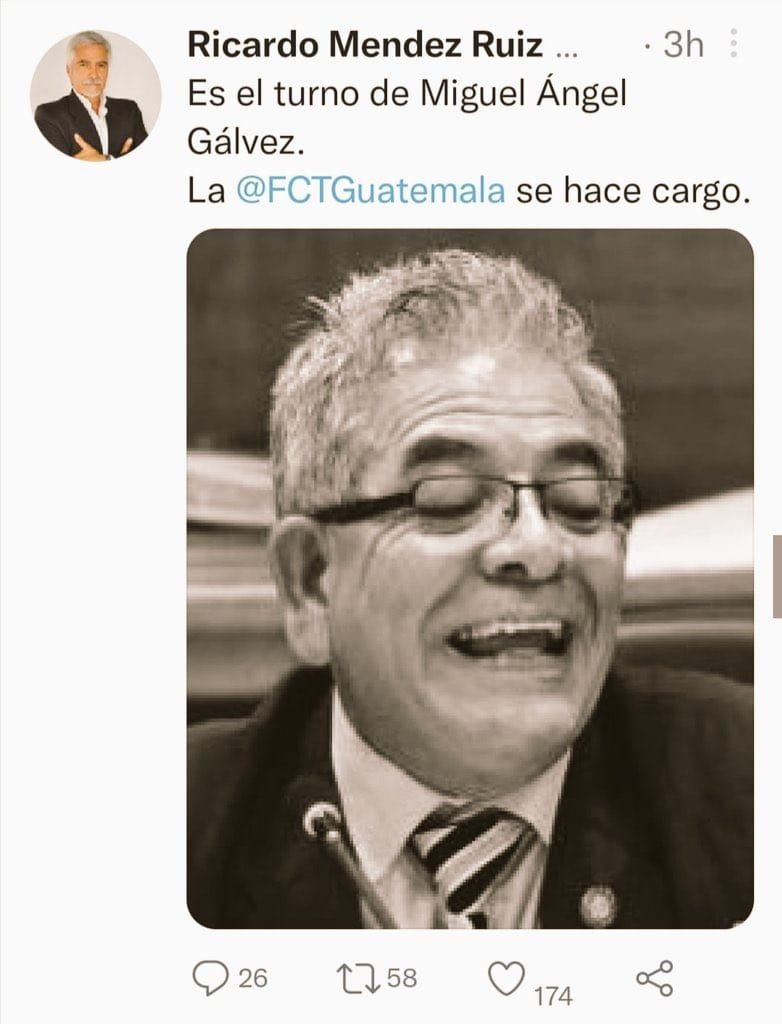 La Fundación Contra el Terrorismo (FCT), brazo visible de grupos oscuros ligados al crimen organizado que buscan impunidad, lanzó una amenaza contra el juez Miguel Ángel Gálvez luego que este decidió enviar a juicio a 9 exmilitares y expolicías por el caso #DiarioMilitar. El líder de esa organización, Ricardo Méndez Ruiz, utilizó las redes sociales para decir que “van” por el juez Gálvez en una clara amenaza como ya lo ha hecho contra fiscales y jueces que han tenido que salir del país.